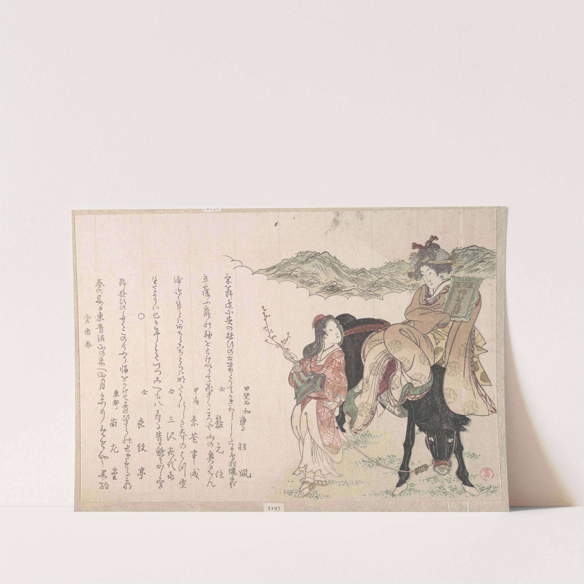 Young Woman on the Back of a Horse Attended by a Female Driver (1813) by Kubo Shunman - Wall Art Print