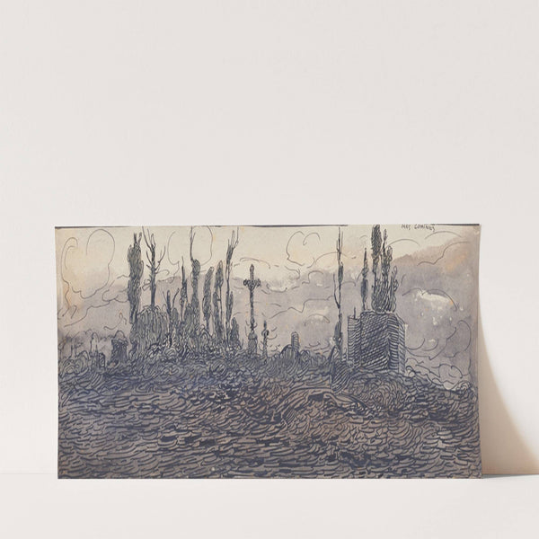 This art print features "Ypres Remember (1919)" by Alfred Ost, beautifully rendered in a monochromatic palette of blues and grays. The composition is intricate, utilizing fine lines and delicate cross-hatching to create a sense of depth and texture throughout the...
