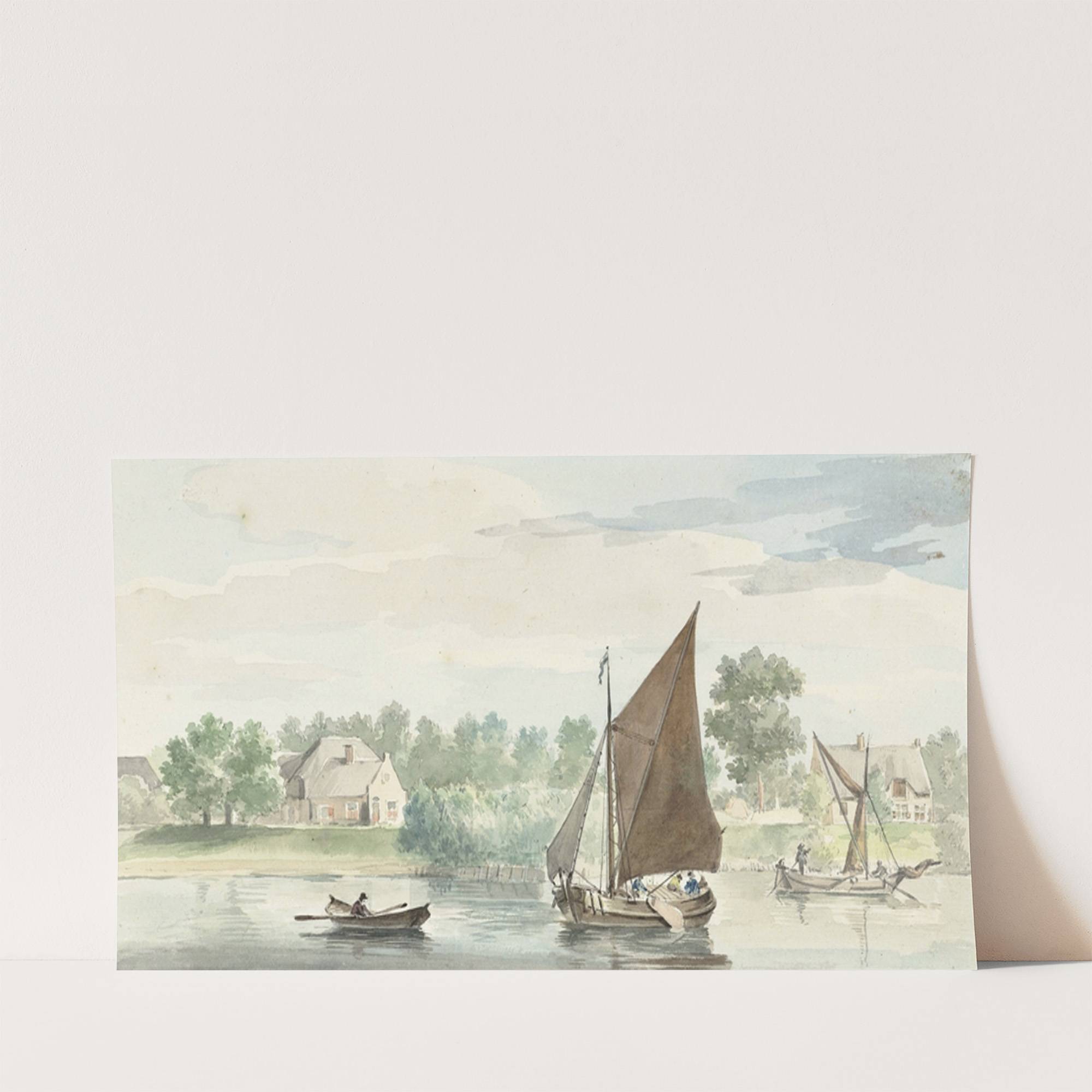 This charming watercolor print features a serene riverscape with soft pastel hues, capturing the essence of a peaceful day on the water. The central focus is a sailboat with its large, golden-brown sails catching the sunlight, gently gliding across the...