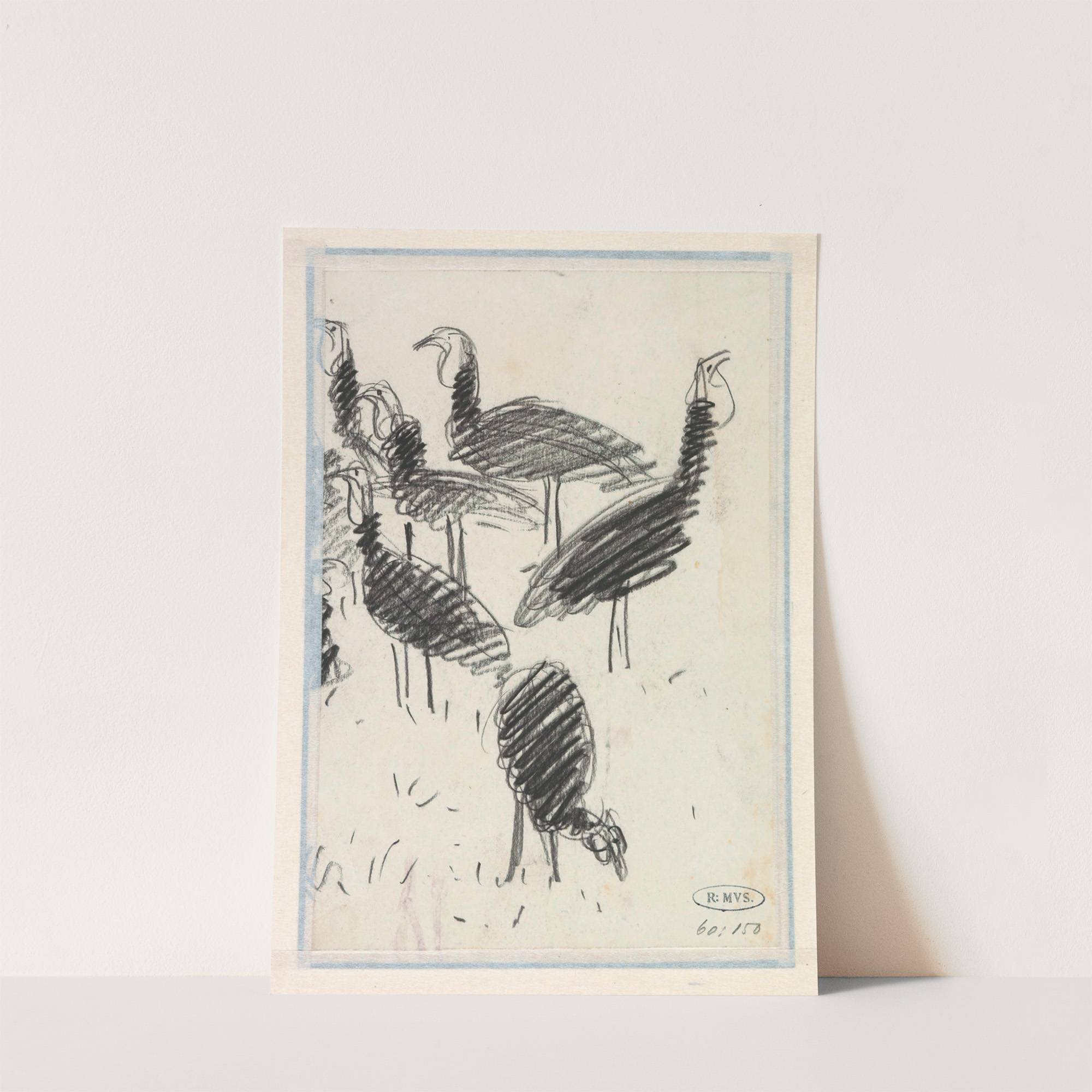 This artwork, "Zes Vogels" by Lucien Suter (noted as 'L. Suter' in the signature), presents a striking black-and-white sketch of six birds standing in a loosely grouped formation. The birds are depicted with expressive, loose brush strokes that create dynamic,...