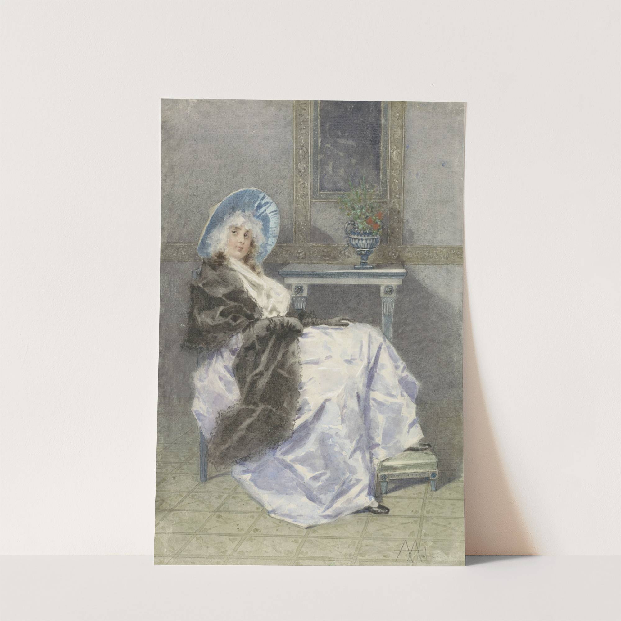 Zittende jonge vrouw met zwarte shawl en paarse rok by Angelo Achini - Wall Art Print