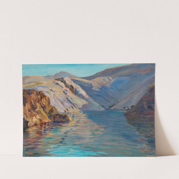 This stunning art print captures the serene beauty of a mountainous landscape reflected in a clear, tranquil body of water. The painting, "Zrnovnica" by Menci Clement Crnčić, showcases vibrant colors and intricate detail with a modern impressionistic style.The foreground features...