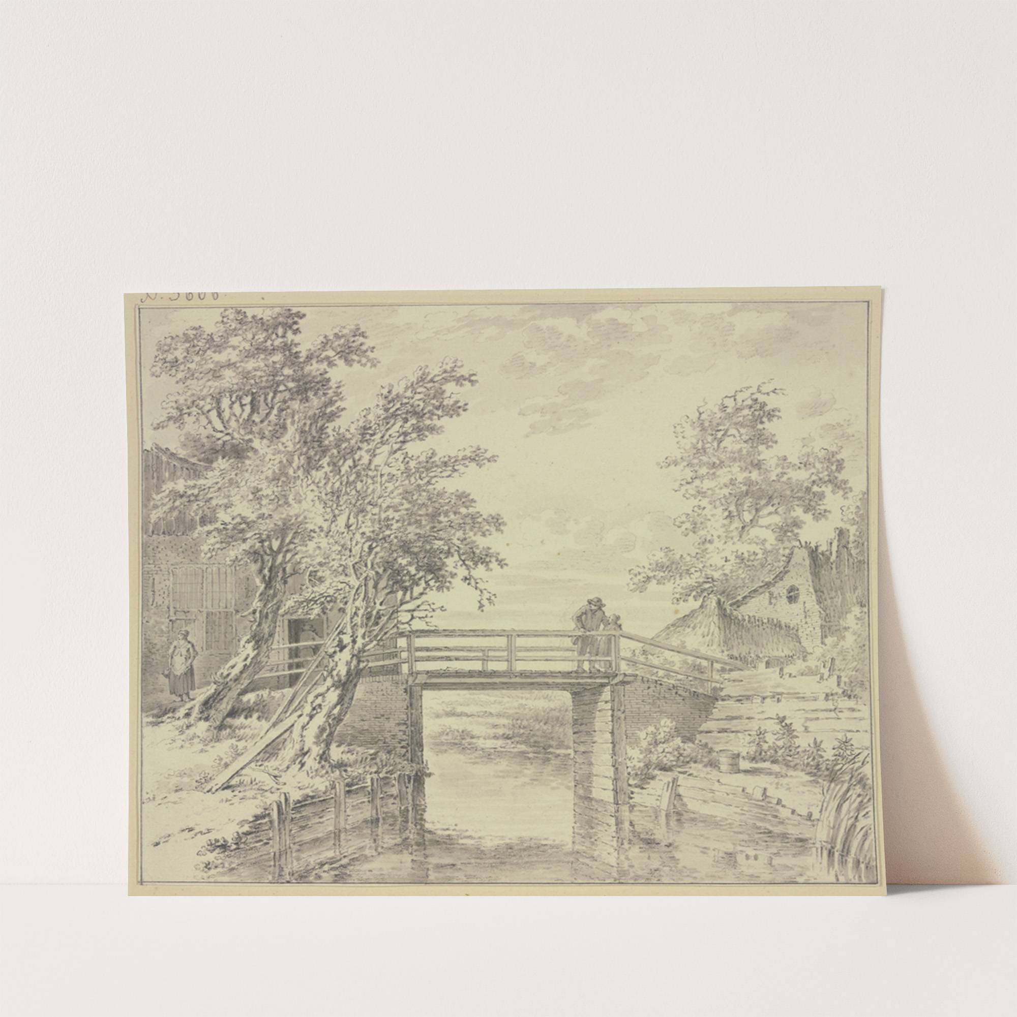 Zwischen Häusern eine Brücke über einen Kanal, auf welcher ein Mann und ein Mädchen stehen by Steven Goblé - Wall Art Print